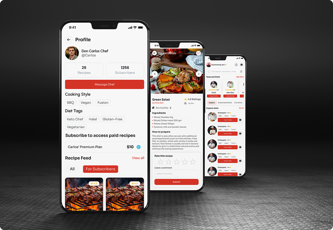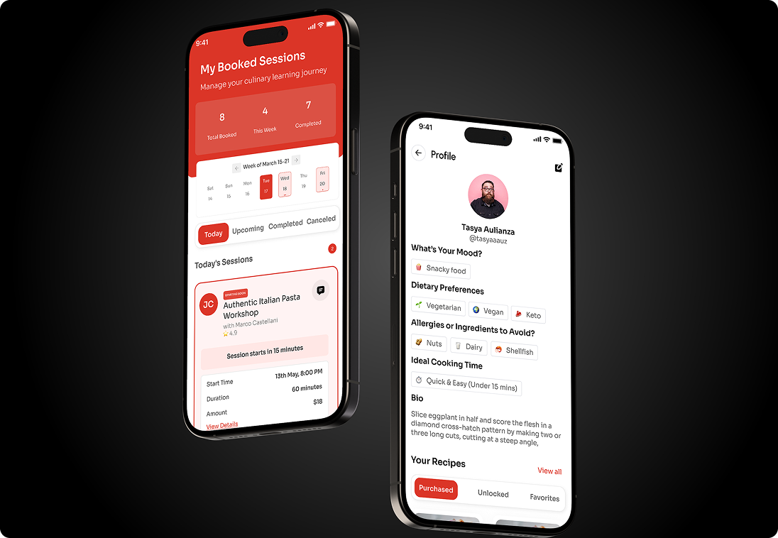 Visitors can explore new dishes, join one-on-one classes, and subscribe to premium chef content in a single, easy-to-use mobile app. Chefs can monetize their skills through subscriptions and live bookings while managing everything from their dashboards.